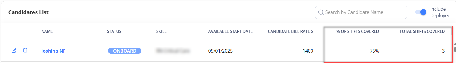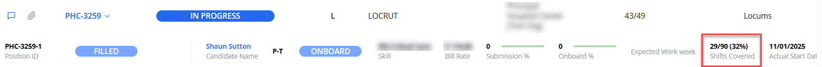 On the Order Management grid, expand the order to view each position's Shift Coverage percentage and the total number of shifts covered (See the imageSee the image). You can also view the same details in the Candidate list section from the order's sidebar (See the imageSee the image).
